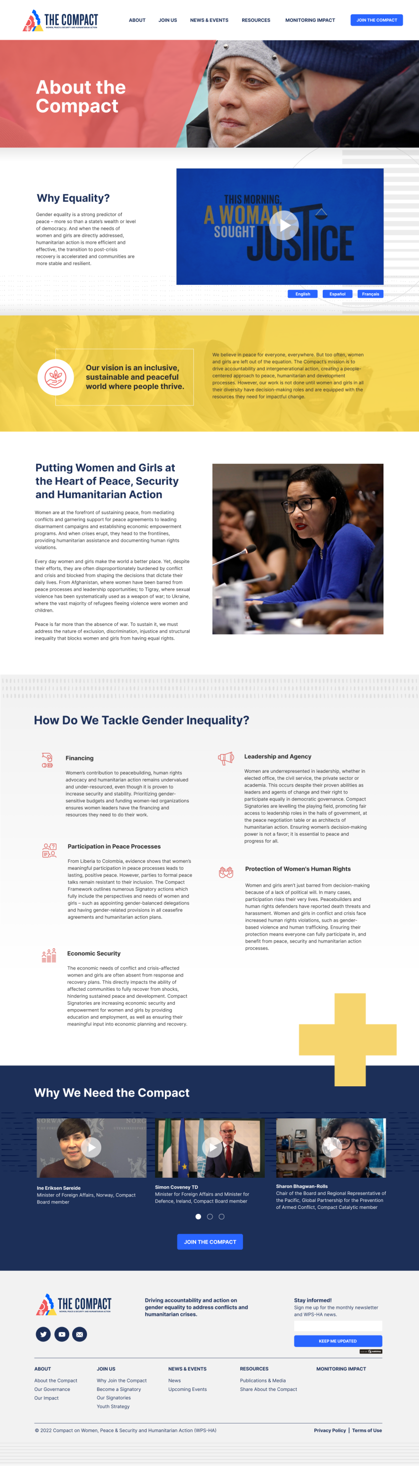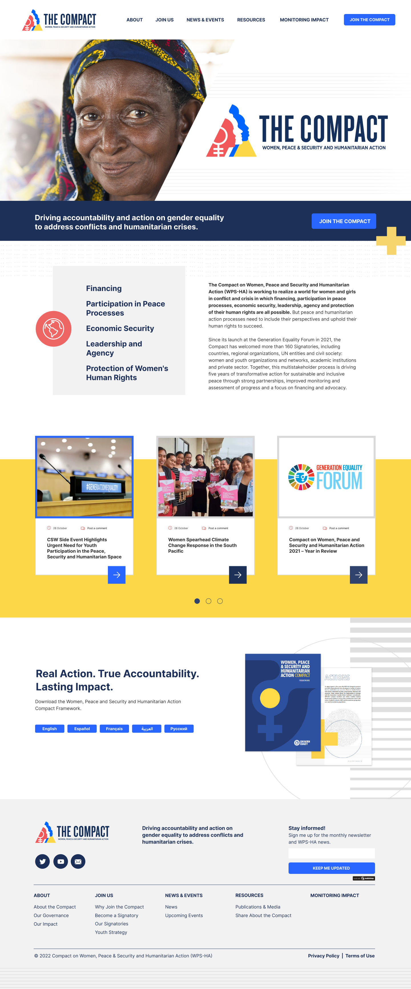 This project involved designing a digital experience for the Compact on Women, Peace, and Security and Humanitarian Action (WPS-HA), an initiative dedicated to advancing the rights, security, and participation of women and girls in conflict and crisis settings. The goal was to create an intuitive and engaging platform that facilitates collaboration among its 215+ global signatories—including governments, UN entities, civil society organizations, and the private sector—to drive transformative action over five years.