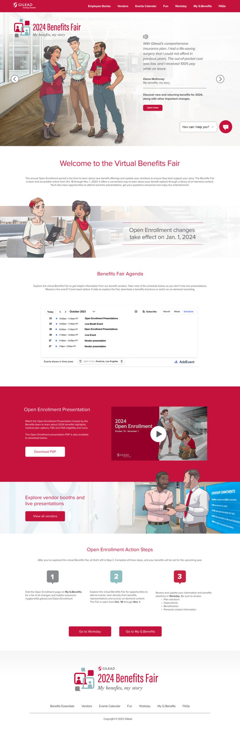 Gilead Sciences promotes their open enrollment period and provides information via a one-stop-shop digital experience for employees. The 2024 Virtual Benefits Fair aimed to remove some barriers from previous years, such as complicated interface interactions and unnecessary steps required prior to accessing information. The experience also focused on alignment to Gilead’s enterprise goal for the year in highlighting and celebrate diversity, including those with disabilities. The campaign theme, “My benefits, my story” helped connect the available benefits to real stories from Gilead employees whose lives had been impacted by them.